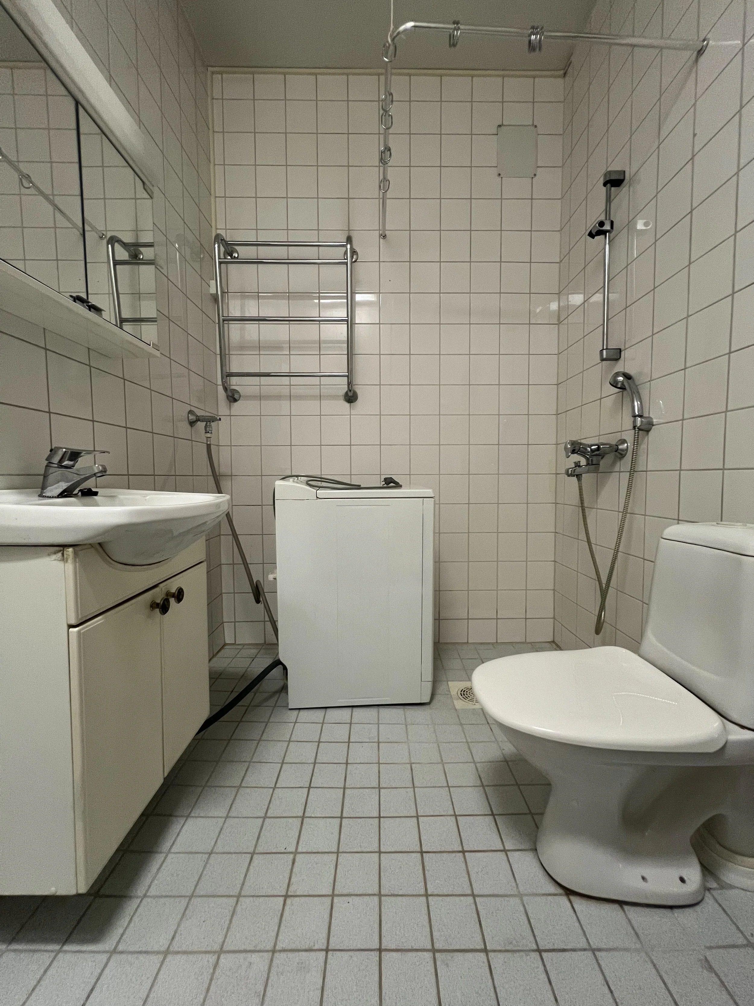 Remontissa uusittiin kaikki pinnat, putket ja kiintokalusteet. Toisen huoneen puolella ollut kiinteä säilytystila yhdistettiin kylpyhuoneeseen, jotta kylppärissä olisi tilaa pesutornille. Näin kokonaisuus vastaisi paremmin lapsiperheen tarpeisiin tässä ajassa. Hyvä kylpyhuone ei ole vain kaunis, vaan myös käytännöllinen. Siksi jokainen yksityiskohta mietittiin arjen näkökulmasta: