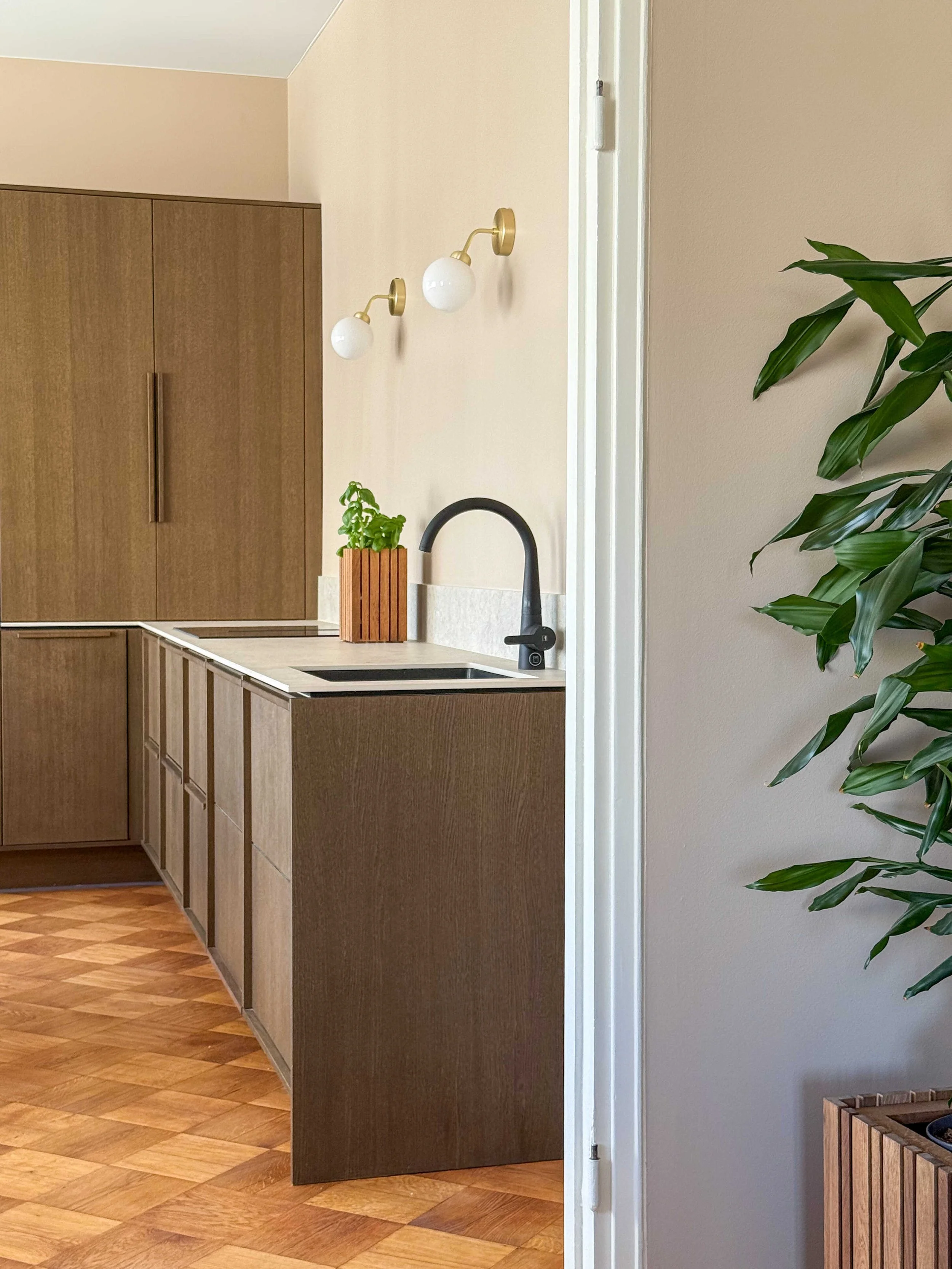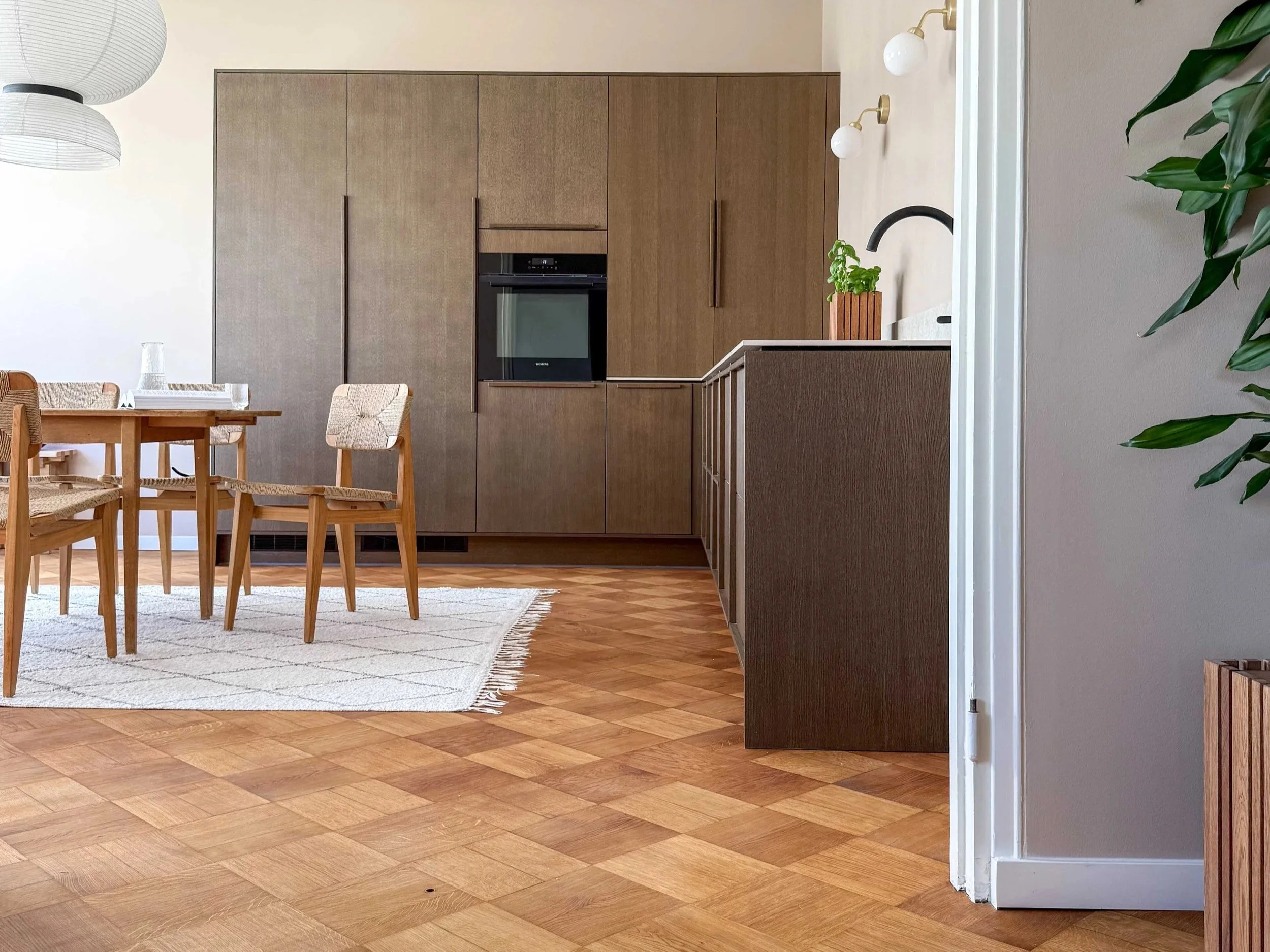 Kun lähdimme toteuttamaan asuntoon kokonaisvaltaista remonttia, yksi asia oli alusta alkaen selvää: halusimme säilyttää mahdollisimman paljon kodin alkuperäistä tunnelmaa ja luonnetta. Vanhassa ”Töölön ruutu” parketissa on sitä jotain, mitä uudistuotanto ei voi täysin jäljitellä. Se kantaa mukanaan aikakauden estetiikkaa, ajan patinaa ja käsityöperinnettä. Se on osa tämän arvokodin identiteettiä ja tarinaa.